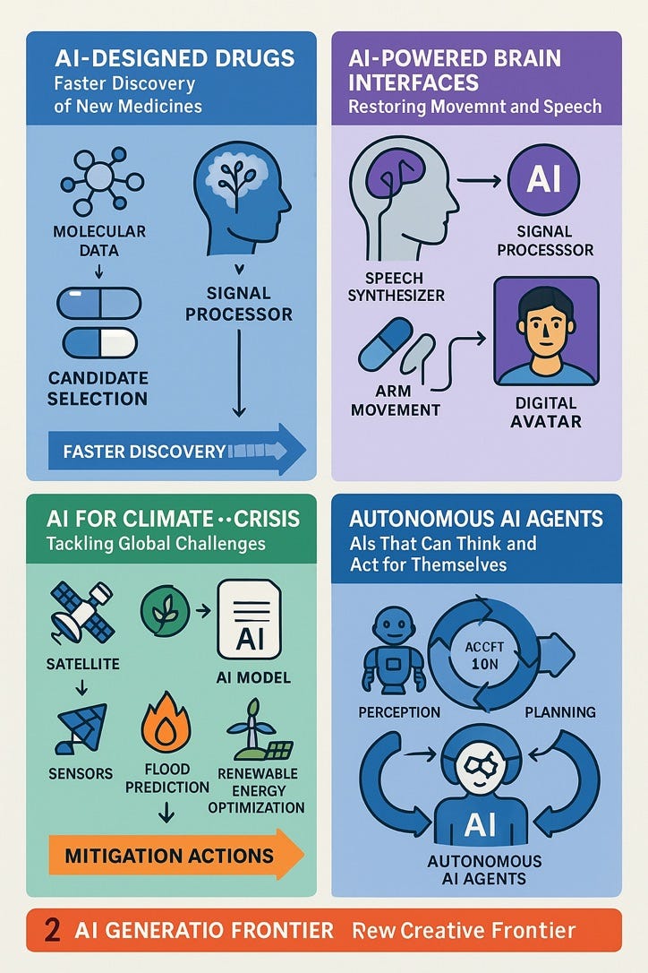 Another domain is neuroscience and brain-computer interfaces, where AI helps decipher neural signals. Brain imaging data or electrical recordings are extremely noisy and complex; machine learning is being used to find patterns that correlate with diseases or to help prosthetic devices interpret a person’s neural signals (e.g., allowing paralyzed patients to control a robotic arm by thought, with AI decoding their brain activity). In the next years, this will improve, potentially restoring more function to people with disabilities via AI-mediated interfaces.