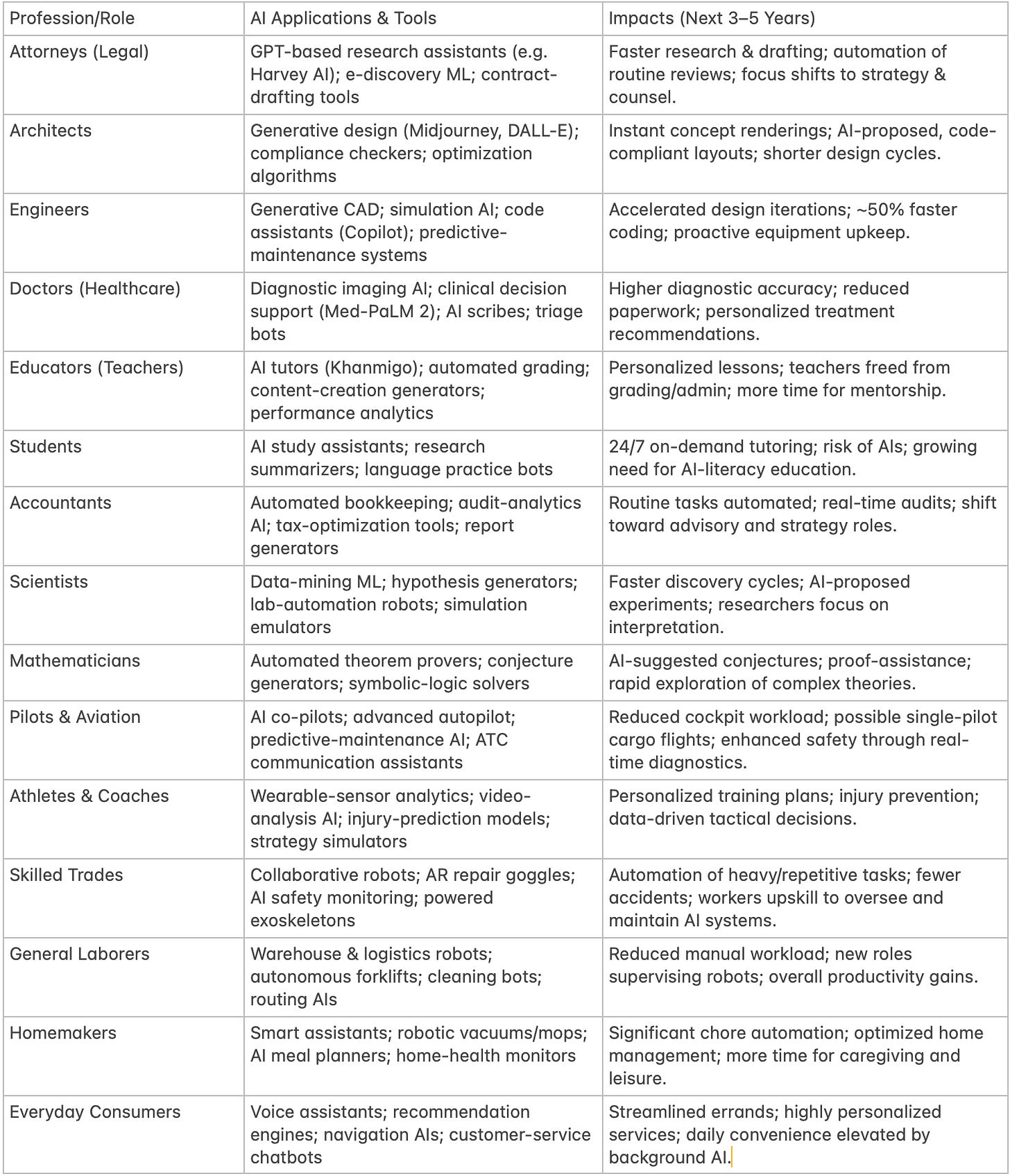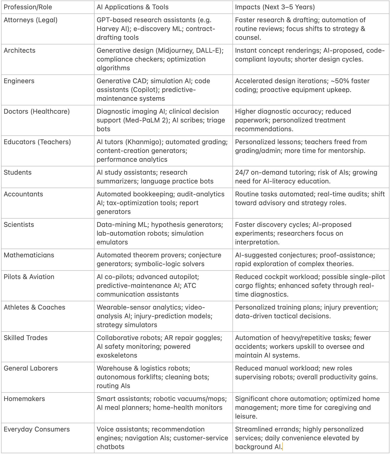 Each of these breakthroughs will amplify AI’s impact across a wide range of professions and social roles. In this report, we explore concrete examples and near-term projections (3–5 years, with glimpses further out) of how AI will reshape work for attorneys, architects, engineers, doctors, educators, students, accountants, scientists, mathematicians, pilots, athletes, skilled tradespeople, homemakers, laborers, and more. The focus is on practical applications and credible forecasts rather than abstract theory. We also include summary tables to organize the anticipated impacts by role.